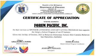 Forum Pacific, Inc., together with its affiliated companies, conducted a gift giving and feeding program for the 130 Aeta students of Buhawen Elementary School in cooperation with its school principal, MS. Jeniffer A. Gonzales last October 3, 2025.